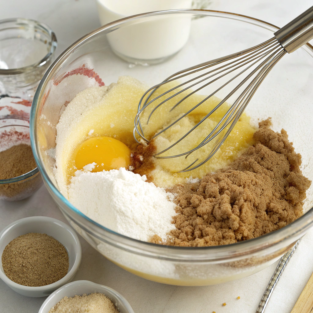 In a large mixing bowl, whisk together melted butter, brown sugar, and granulated sugar until smooth and glossy. Add the egg, egg yolk, and vanilla extract. Whisk again until creamy and well combined.