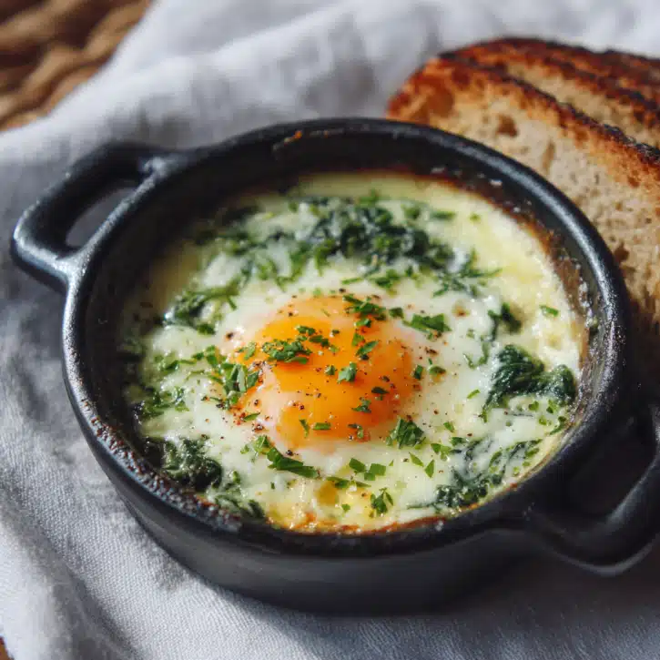 Baked Eggs with Spinach and Cream is a cozy, easy breakfast or brunch dish. I sauté onions, garlic, and fresh spinach, season with salt, pepper, and a pinch of nutmeg, and layer it in buttered ramekins. Pour cream over the spinach, add a fresh egg to each ramekin, sprinkle Parmesan, and bake at 180°C until the yolks reach your preferred doneness. Serve warm with toasted bread. This simple recipe feels indulgent and comforting, perfect for weekend mornings or a special brunch. It’s versatile, nourishing, and brings everyone together around the table.