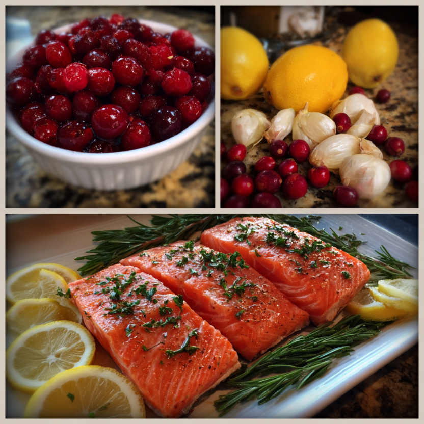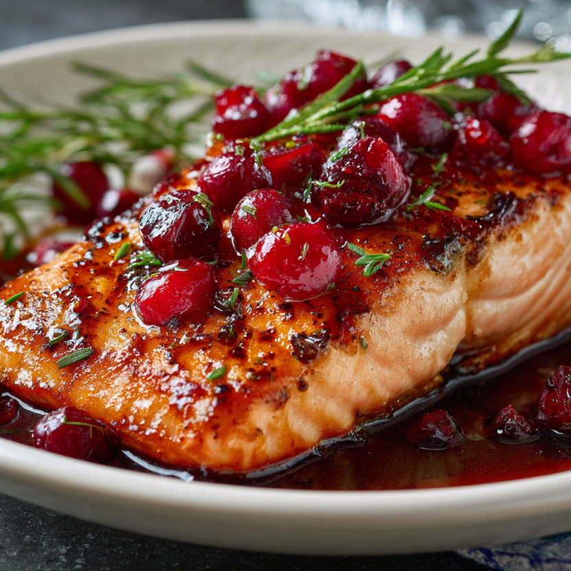Transfer the salmon to a serving platter. Drizzle with the reserved cranberry glaze and garnish with fresh lemon slices, rosemary sprigs, and a sprinkle of sea salt.