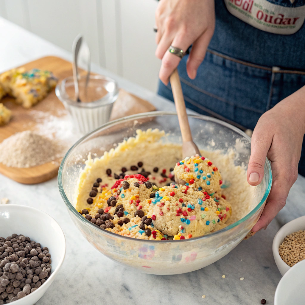 Fold in the rainbow sprinkles and chocolate chips. The dough should look colorful and festive!