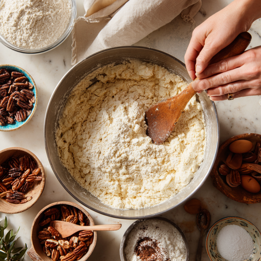 Gradually add the dry ingredients to the wet mixture, stirring until a soft dough forms. If you’d like, fold in chocolate chips or chopped pecans for extra richness.