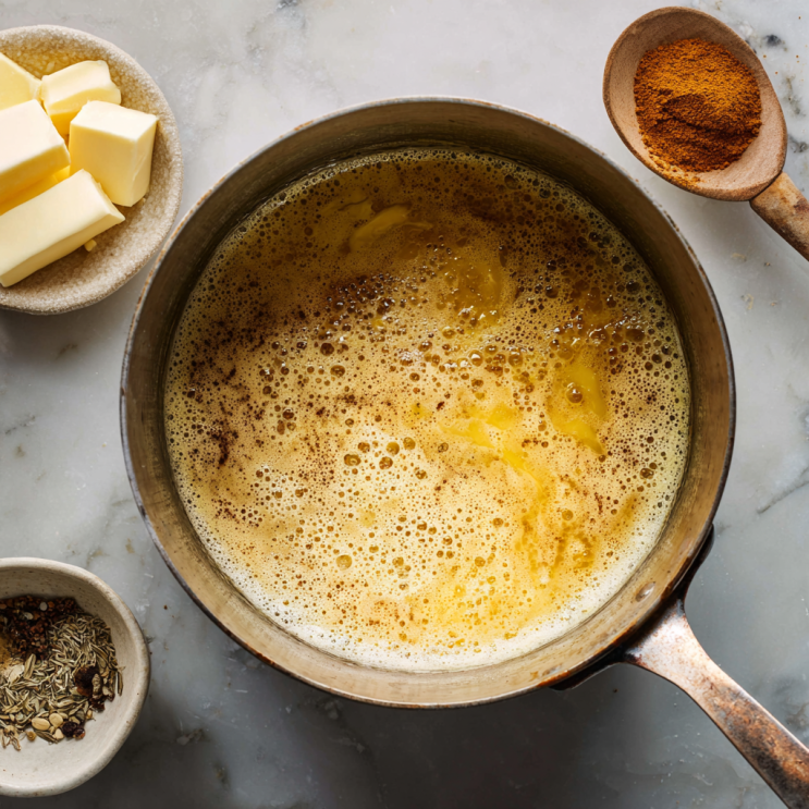 Start by placing your butter into a medium saucepan over medium heat. Let it melt slowly, then continue cooking. You’ll notice it foams, then clears, then forms tiny golden specks on the bottom. Swirl the pan gently until it smells nutty and caramel-like.