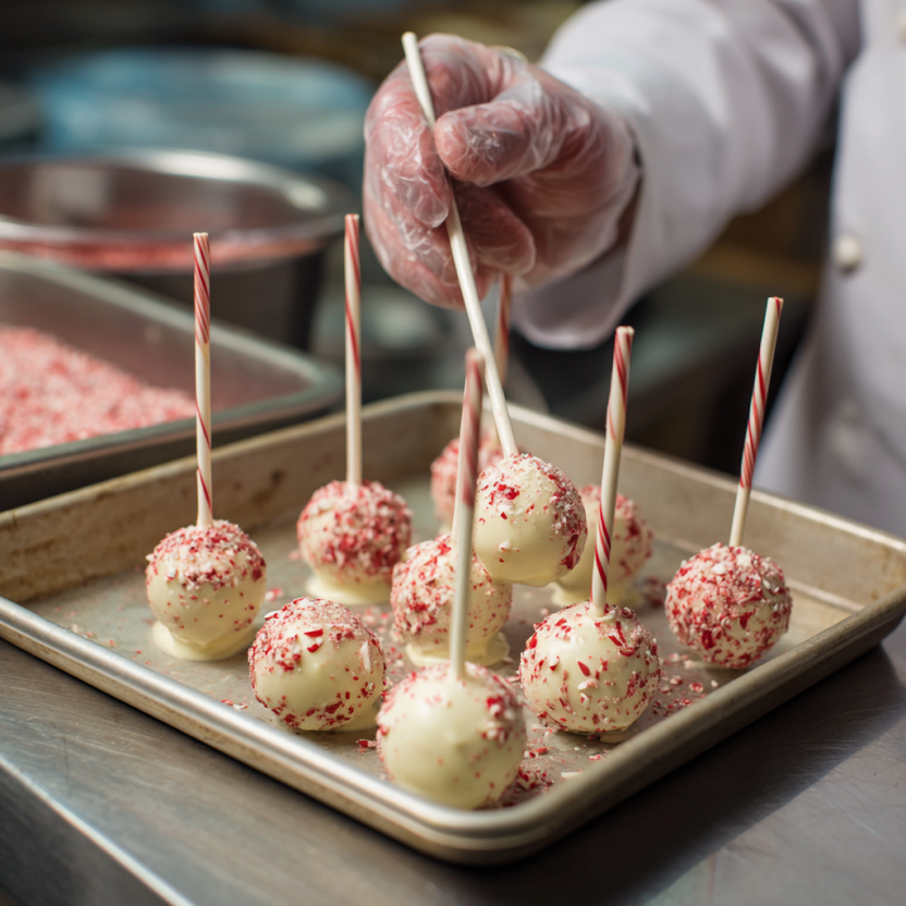 Immediately roll the coated cake pops in crushed candy canes before the coating sets.