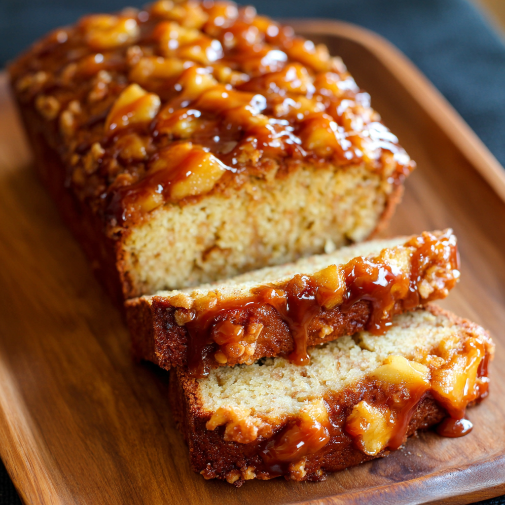 - Cool & Serve: Let the loaf cool in the pan for 10–15 minutes, then transfer to a wire rack. Slice and serve warm or at room temperature, with an extra drizzle of caramel if desired.