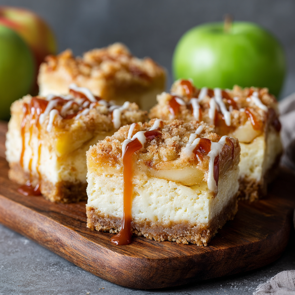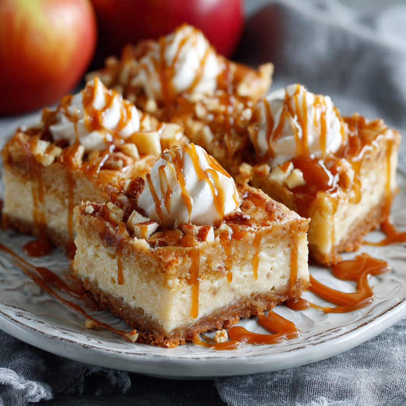 Enjoy a sweet autumn treat with these Caramel Apple Cheesecake Bars! 🍎🍰 Start with a buttery graham cracker crust, then cook diced apples with cinnamon, nutmeg, and brown sugar. Pour a creamy cheesecake mixture over the warm apples, then bake until set. Let the bars cool and drizzle with luscious caramel sauce. Chill for at least 2 hours, then slice into squares and serve. Perfect for sharing at parties, family dinners, or just as a cozy indulgence at home. These bars combine sweet, tart, and creamy flavors in every bite simple, irresistible, and absolutely unforgettable!