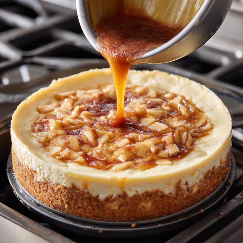 Spread the cooked apples evenly over the baked crust. Pour the cheesecake mixture over the apples, smoothing the top. Bake for 25–30 minutes, or until the cheesecake is set but still slightly jiggly in the center.