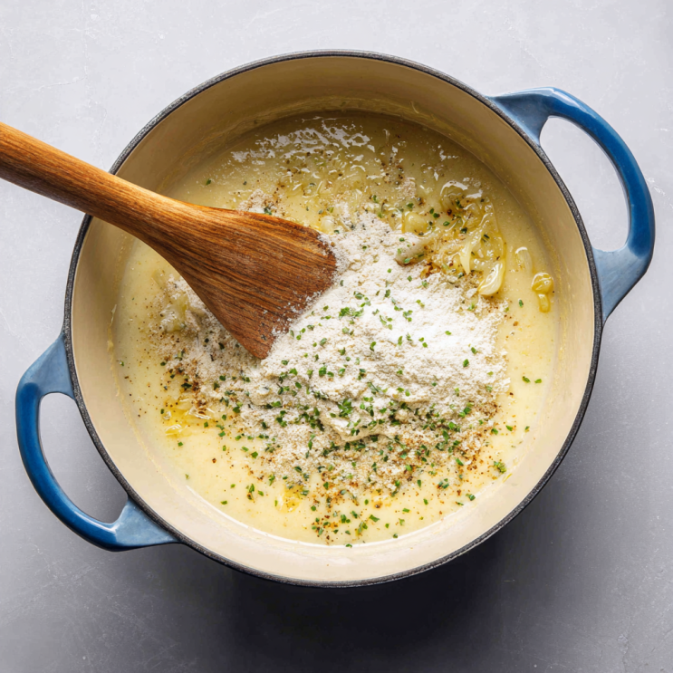 In a large pot, melt the butter over medium heat. Add the onions and sauté until softened and fragrant, about 5 minutes. Stir in the garlic and cook for another minute. Sprinkle the flour over the mixture and whisk to create a smooth roux this will give your soup its creamy texture.