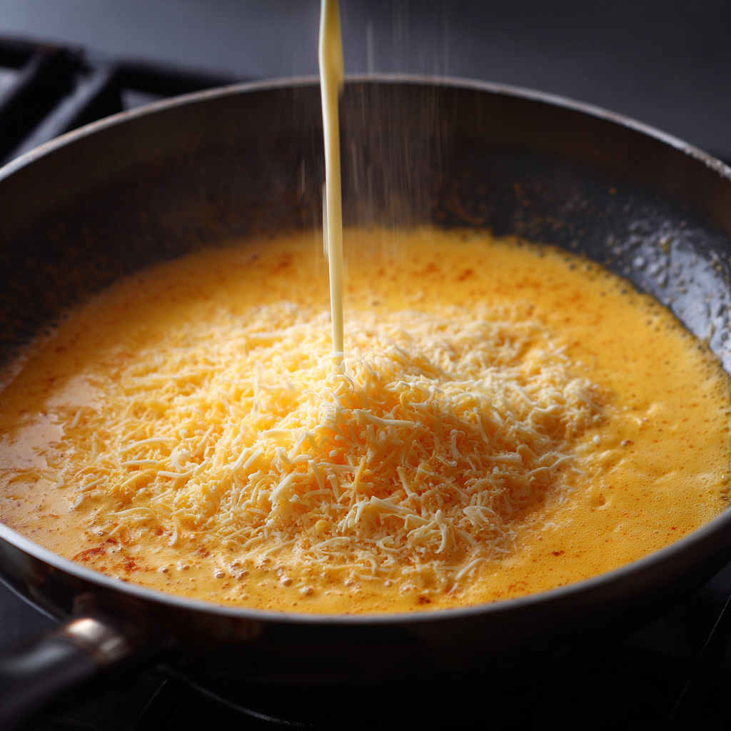 Reduce heat to low. Stir in the cheddar cheese a little at a time until melted and smooth. Pour in the milk or cream and mix well. Season with salt, pepper, and paprika.