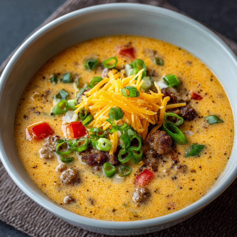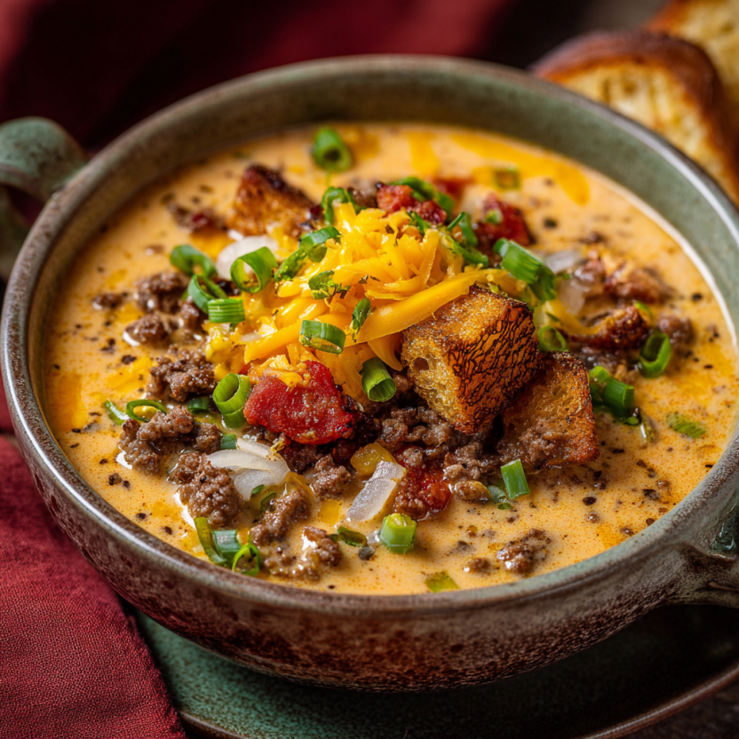 Cheeseburger Soup is like a cozy hug in a bowl—rich, creamy, and packed with all the flavors of a classic cheeseburger. I remember making this on chilly evenings in Crete with my friends, and the smell of melted cheese and savory beef always filled the kitchen. Ground beef, onions, potatoes, and carrots simmer in a creamy broth, then shredded cheddar is added for that perfect cheesy finish. Top it with crispy bacon and a sprinkle of green onions, and you have a warm, comforting meal everyone will love. Perfect for lunch or dinner! 🧀🥔🥕🍔