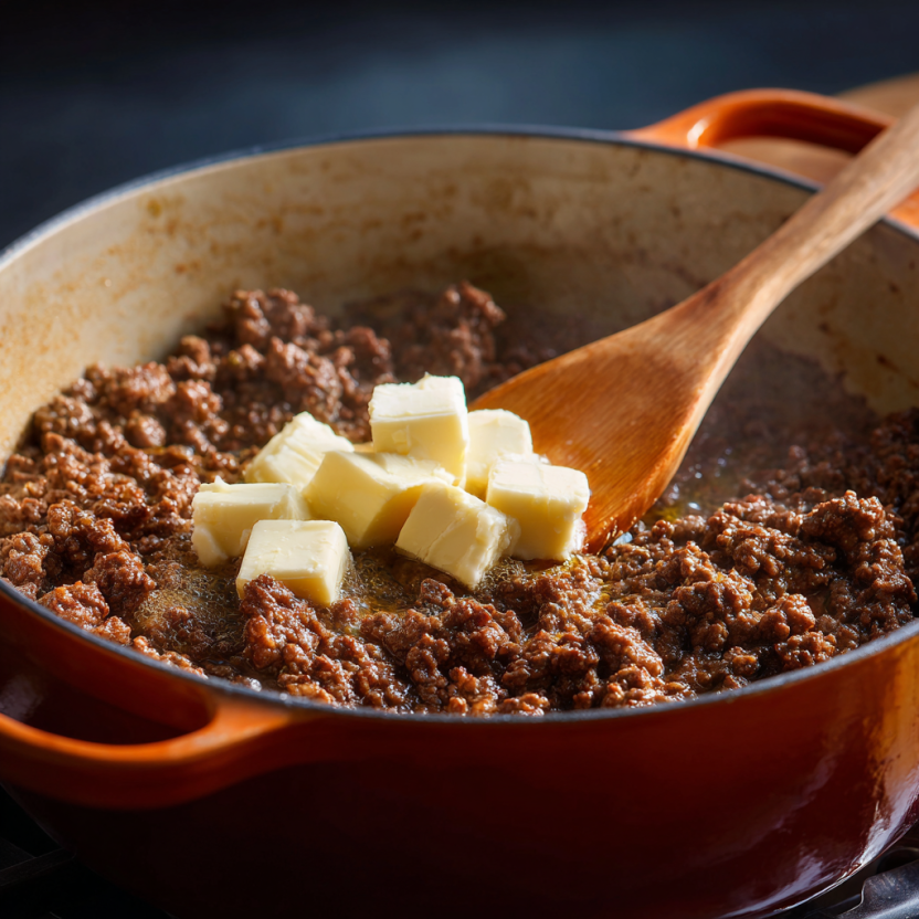 In a large pot, melt butter over medium heat. Add ground beef and cook until browned. Drain excess fat. - Add Aromatics