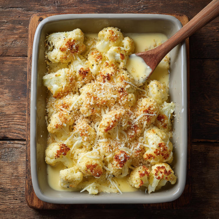 Place the cauliflower florets in your baking dish. Pour the cheese sauce evenly over the top, coating everything well. Sprinkle with Parmesan and breadcrumbs for that irresistible golden crust.