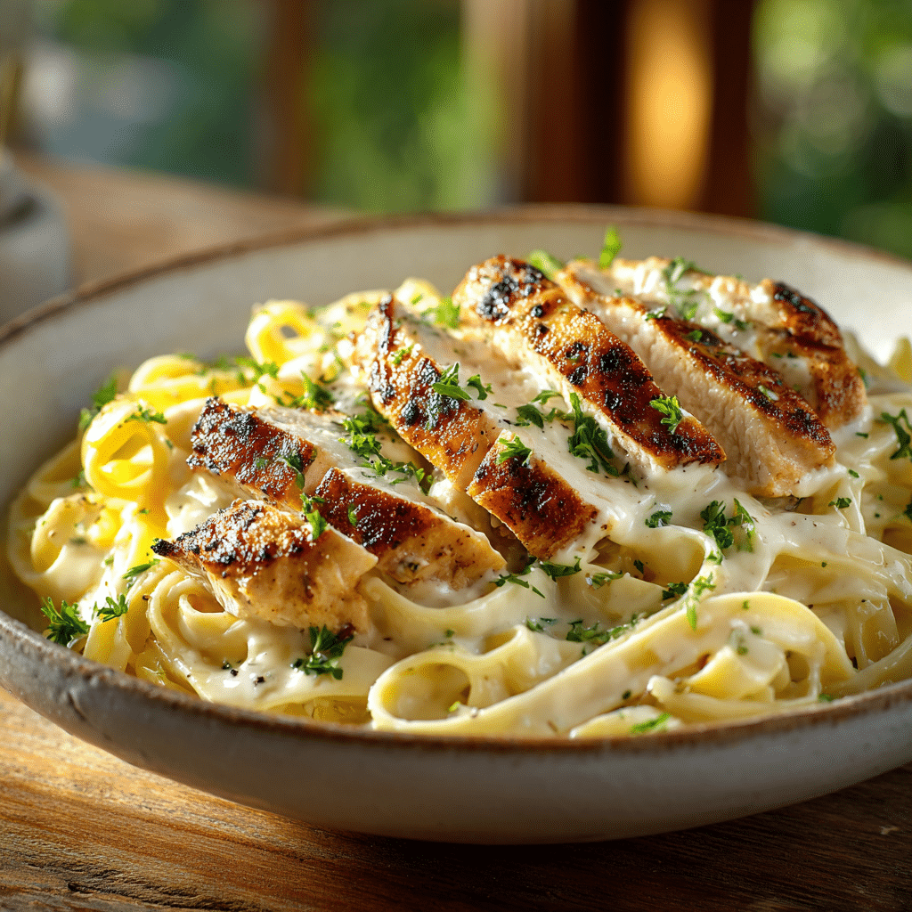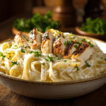 Chicken Fettuccine Alfredo is my go-to comfort dish. Tender chicken and silky fettuccine are enveloped in a rich Parmesan cream sauce, flavored with garlic and a hint of nutmeg. I cook the pasta just shy of al dente, toss it in the creamy sauce, and finish with juicy, golden chicken. A sprinkle of parsley adds freshness. Serve immediately for maximum indulgence. Leftovers store well and reheat beautifully with a touch of milk. This recipe is simple, cozy, and perfect for weeknight dinners or special occasions, bringing warmth, flavor, and a little bit of magic to every bite.