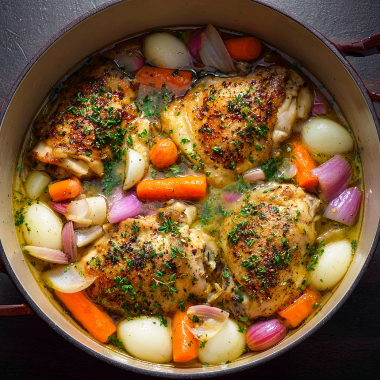 Pour in chicken broth, then add thyme, parsley, and the bay leaf. Stir well. Return the browned chicken to the pot. Bring to a gentle boil, then reduce heat. Let the soup simmer for 20–25 minutes.