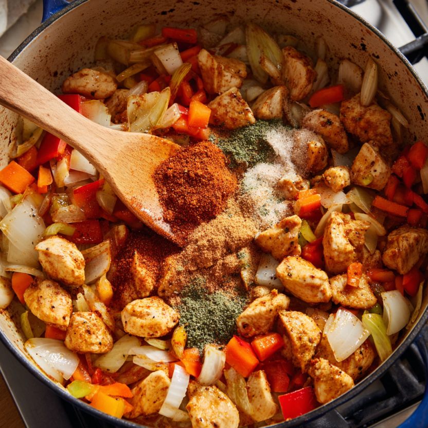 Add the chicken directly to the pot. Stir it with the vegetables so it absorbs all those flavors. Sprinkle in cumin, chili powder, smoked paprika, salt, and pepper. Cook until the chicken turns white on the outside.