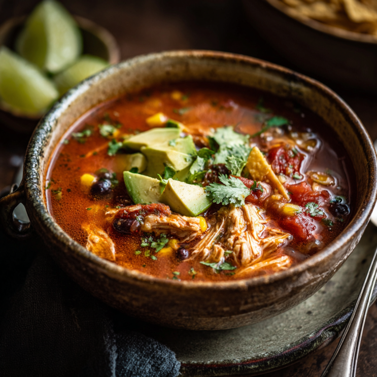 Serve Chicken Tortilla Winter Soup hot, topped with crispy tortilla strips, avocado slices, shredded cheese, and a spoon of sour cream. Pair it with warm bread or a simple green salad for a complete winter meal.