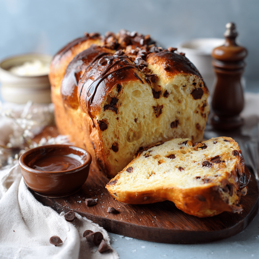 Use slightly stale brioche for best results. Mini chocolate chips distribute more evenly. Store leftovers in the fridge for up to 2 days and reheat gently in a pan or oven.