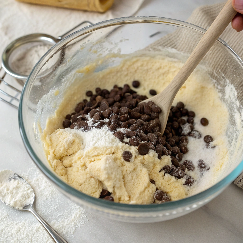 Stir in 3 tablespoons of all-purpose flour and a pinch of salt until the dough forms. Fold in chocolate chips and smooth the top. Add a few extra chips for a melty finish!