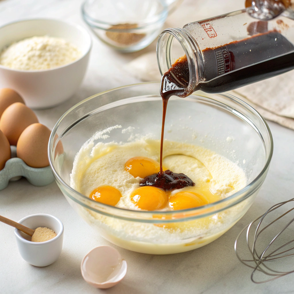 Beat in the eggs, one at a time, followed by vanilla extract. Make sure each egg is fully incorporated before adding the next. The mixture should be smooth and slightly fluffy.