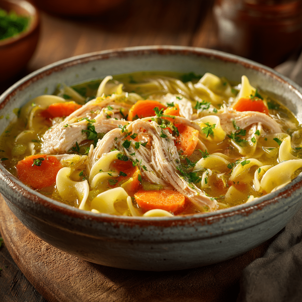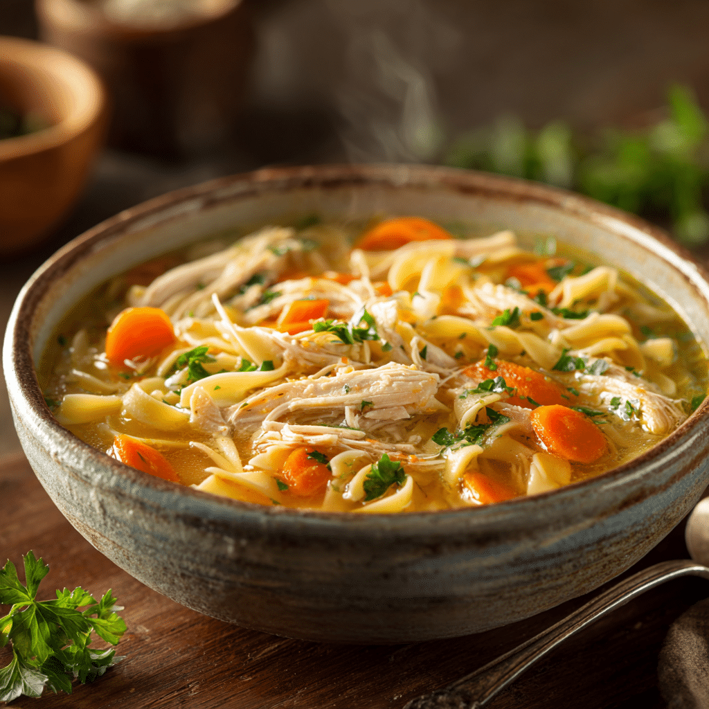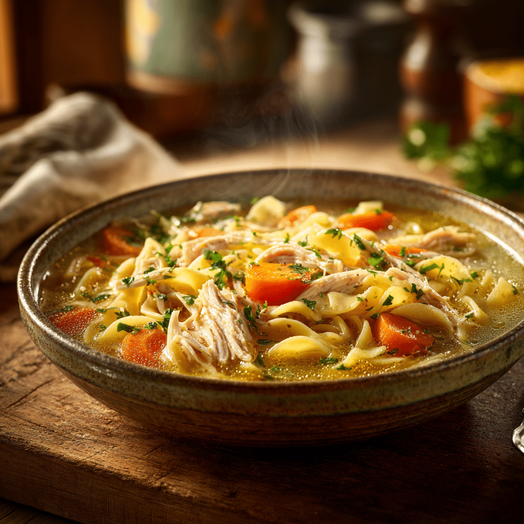 Cozy up with this Classic Chicken Noodle Soup! Tender chicken, fresh vegetables, and hearty noodles simmer in a golden broth for the ultimate comfort meal.