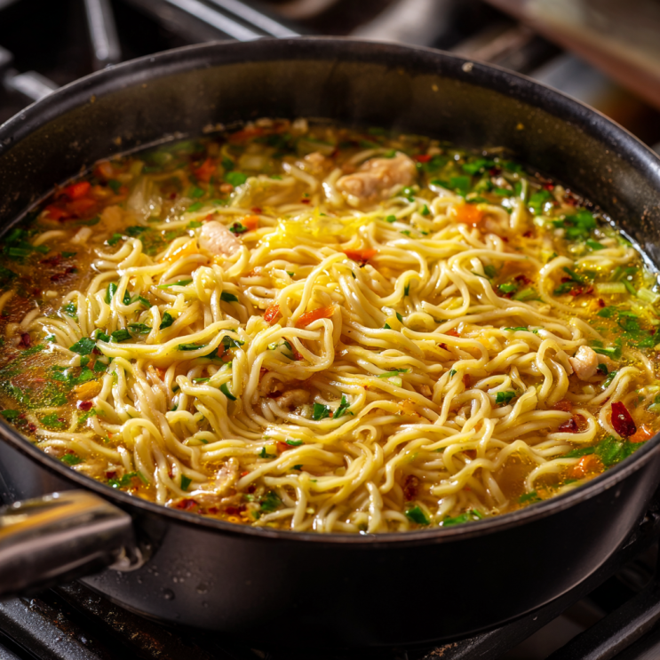 - Cook noodles in soup.