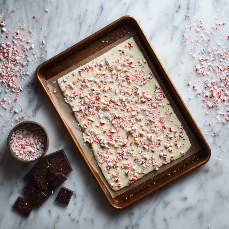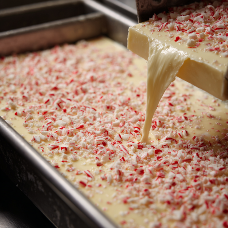 While the white chocolate is still soft, sprinkle crushed candy canes evenly across the surface.