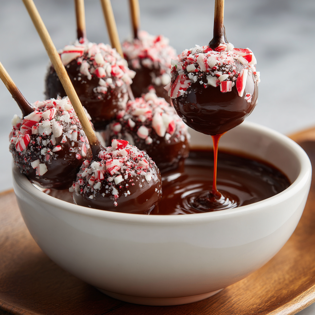 Melt the remaining chocolate. Dip each cake pop fully into the chocolate, gently tapping to remove excess. Sprinkle crushed peppermint on top before it sets.