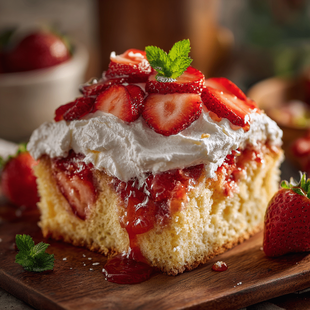 I serve this cake chilled, straight from the fridge. It’s perfect for birthday parties, summer picnics, or any time I want a light, fruity dessert. I cut it into generous squares and watch the layers of moist cake and bright strawberry filling delight everyone. It pairs beautifully with a cup of tea or a glass of milk.