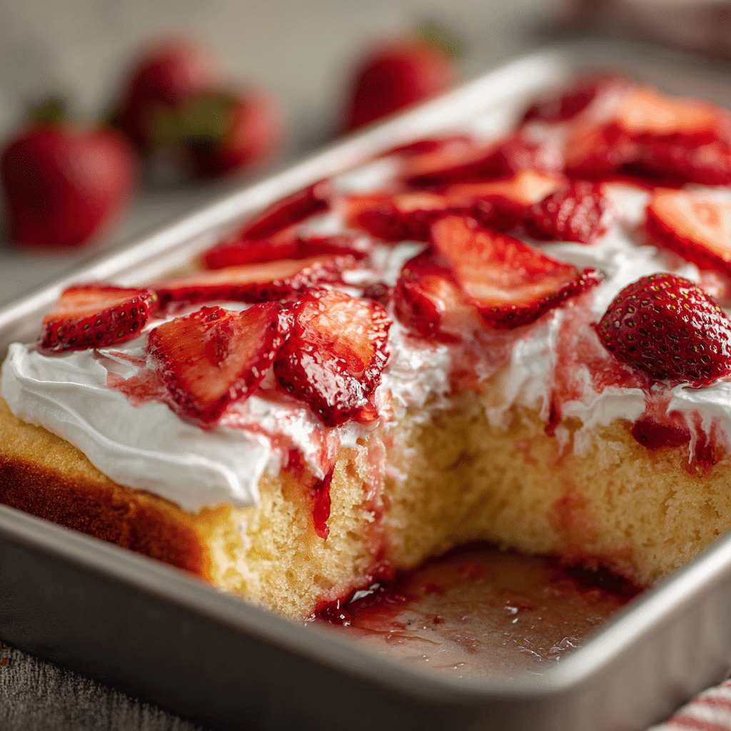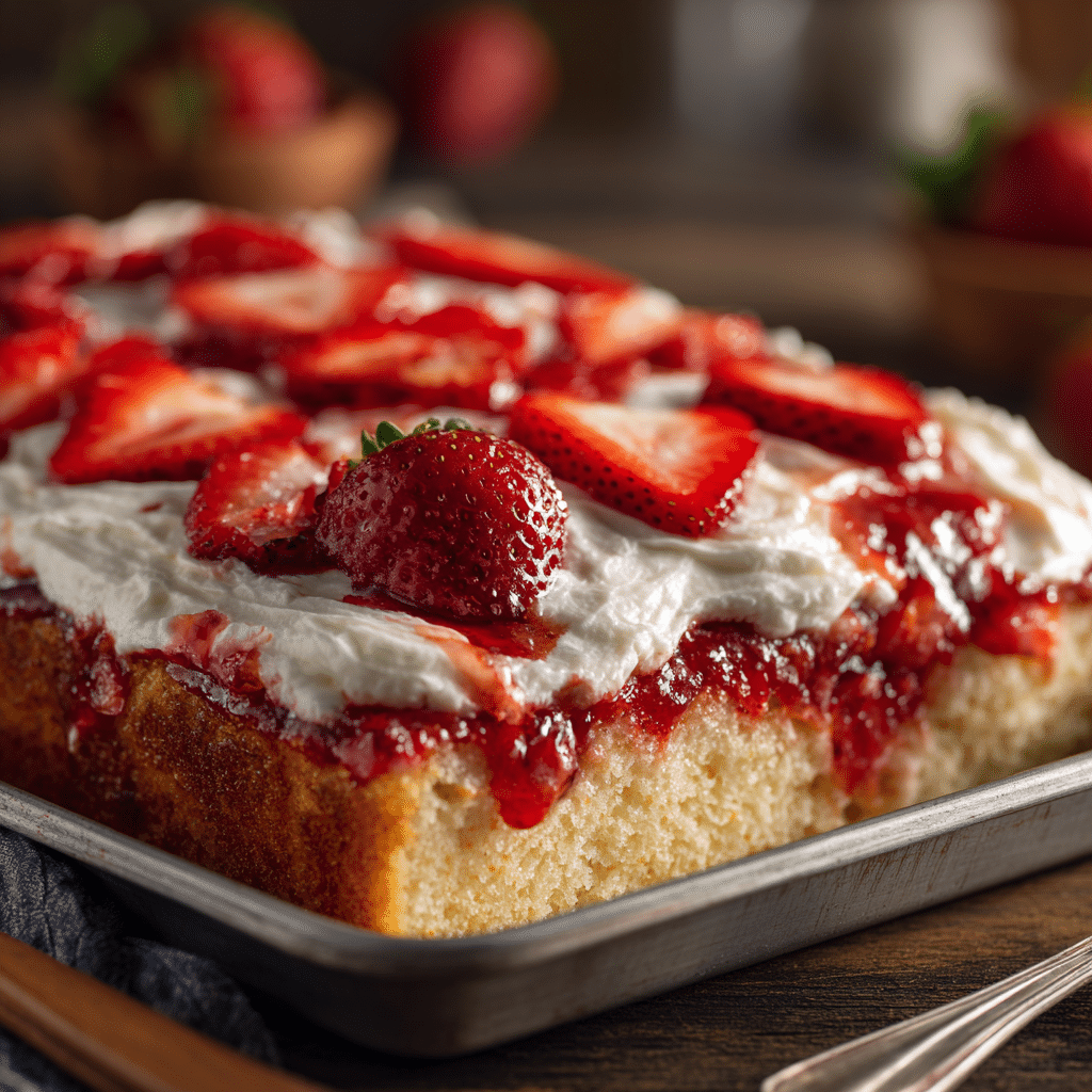This cake is pure joy. I love how the strawberry Jello transforms a simple white cake into something spectacular. The poke technique is easy but creates a wow factor that always impresses. I also love the creamy topping whipped cream or cream cheese frosting adding a soft, smooth texture that contrasts perfectly with the fruity, slightly tangy strawberry filling.