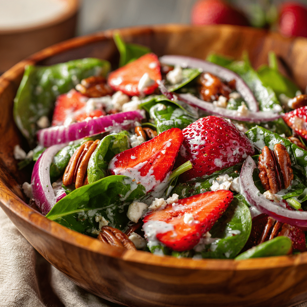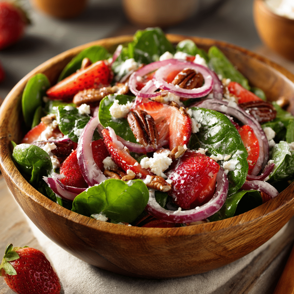 - Assemble the Salad: In a large salad bowl, combine the baby spinach, sliced strawberries, red onion, and toasted pecans.