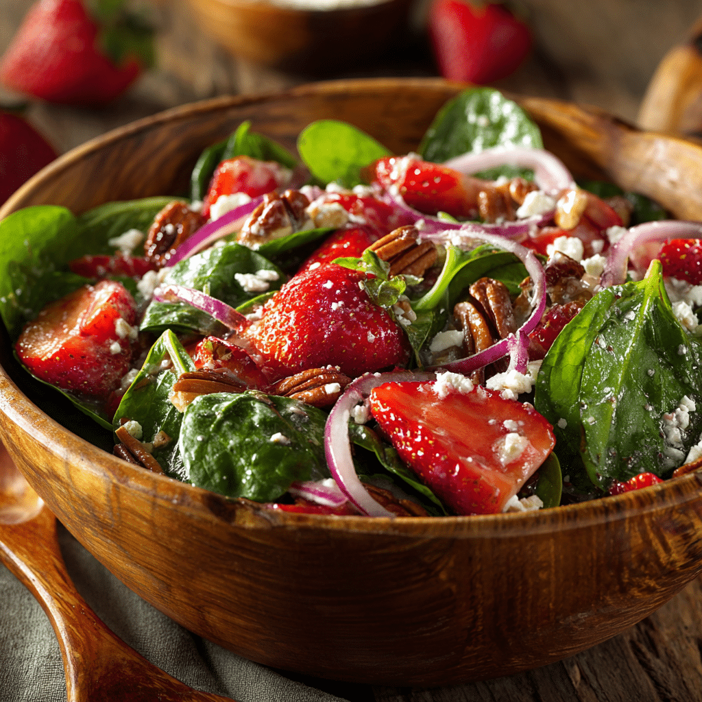 Ever since that day, this strawberry spinach salad has become a staple in our home, especially during spring and summer. It’s simple yet elegant, refreshing yet satisfying, and it never fails to bring smiles to the table. I’ve perfected it over time, experimenting with little tweaks like adding toasted pecans for crunch or a touch of feta for a creamy tang. The combination of textures and flavors is irresistible the sweet strawberries, the slightly bitter spinach, the crunchy nuts, and the smooth, sweet poppy seed dressing all come together in perfect harmony.
