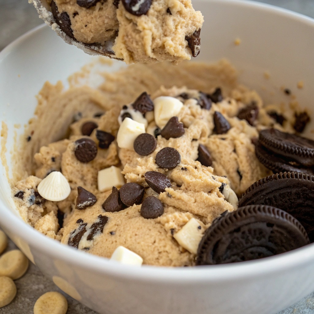 Gently fold in chocolate chips, white chocolate chips, crushed Oreos, and mini cookies. The dough will be thick and filled with chunks — just the way Cookie Monster would like it!
