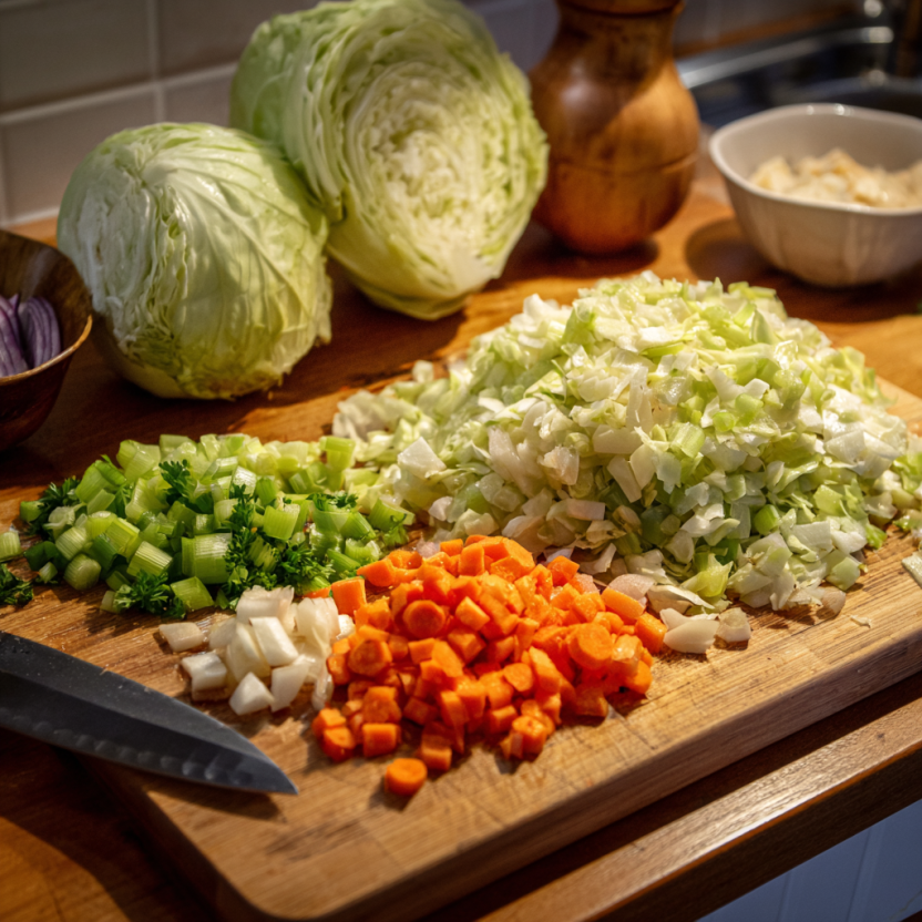 - Prepare the veggies: Wash and chop the cabbage, onion, carrots, and celery. Mince the garlic.