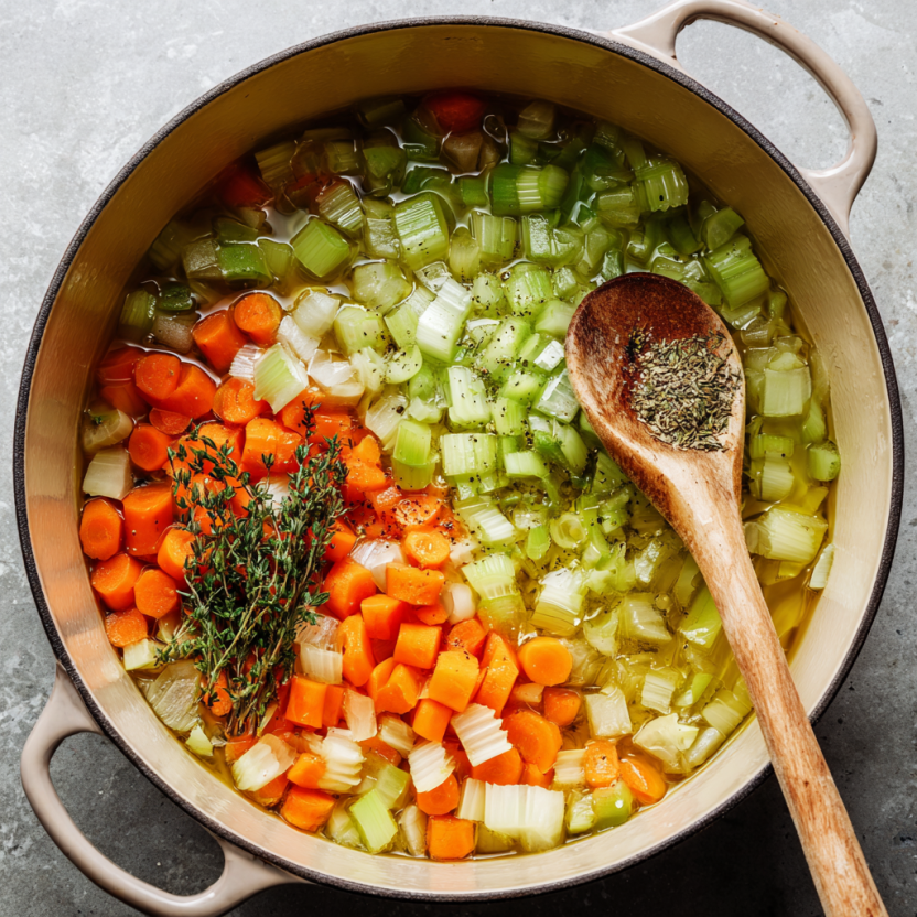 Start by heating olive oil in a large pot over medium heat. Add the chopped onion, carrots, and celery, and sauté until softened and fragrant. This step builds the flavor foundation of your soup, so don’t rush it.
