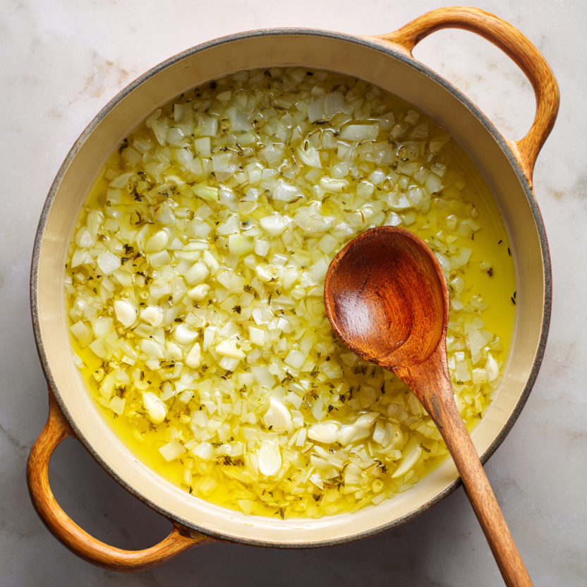 Start by heating olive oil and butter in a large pot over medium heat. Once melted, add the chopped onion and cook until soft and translucent. Stir in the garlic and cook just until fragrant.
