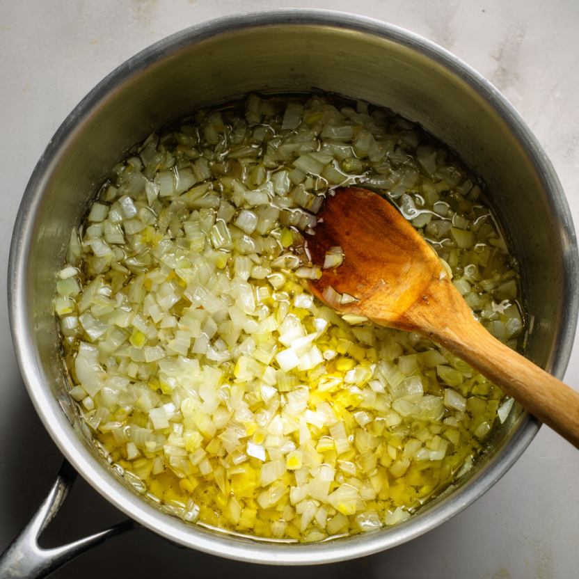 Start by heating olive oil in a large pot over medium heat. Add the chopped onion and cook until it turns soft and translucent. This step builds the base flavor of the soup, so don’t rush it.