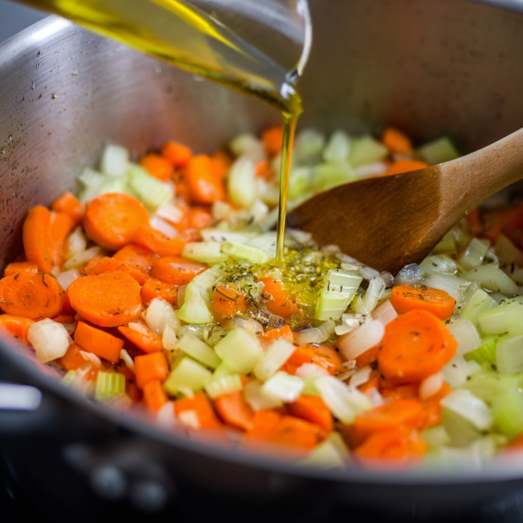 Heat olive oil in a large pot over medium heat. Add the onion, garlic, carrots, and celery. Cook for about 5–7 minutes until the vegetables are soft and fragrant.