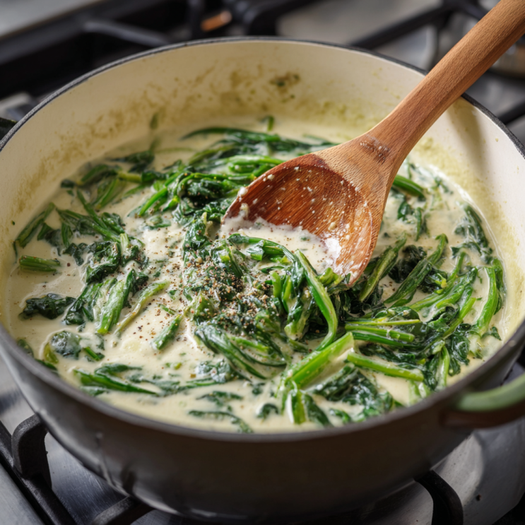 Stir in the heavy cream and season with salt and black pepper to taste. If using, add the spinach or kale and cook for an additional 3–4 minutes until wilted.