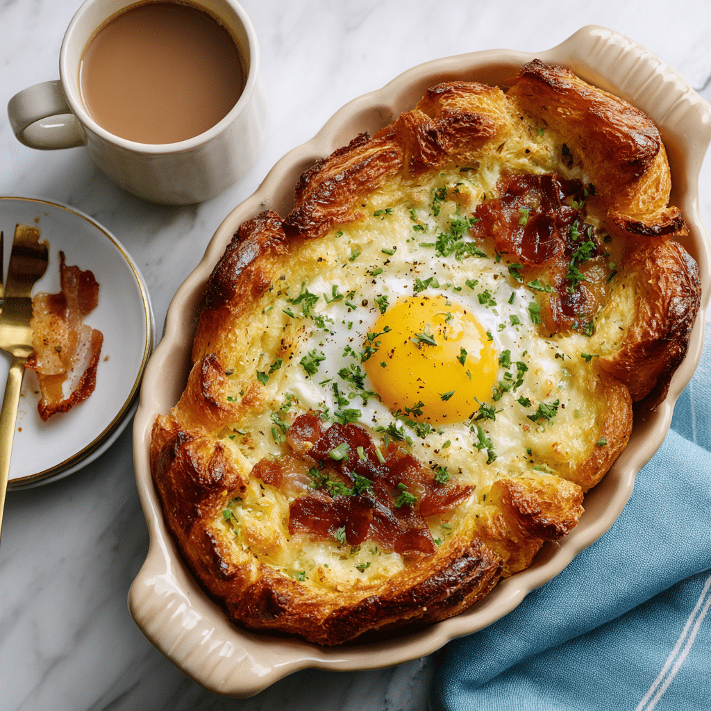 There’s something magical about a breakfast baked in the oven. While the croissants puff up and the eggs set to creamy perfection, the aroma fills the entire house. It’s comforting and inviting. The beauty of this Croissant Egg Bake is how flexible it is. You can make it plain for a classic flavor, add vegetables for freshness, or toss in meats and cheeses for indulgence. Plus, it’s a stress-free recipe no flipping pancakes, no precise timing just assemble, bake, and enjoy.