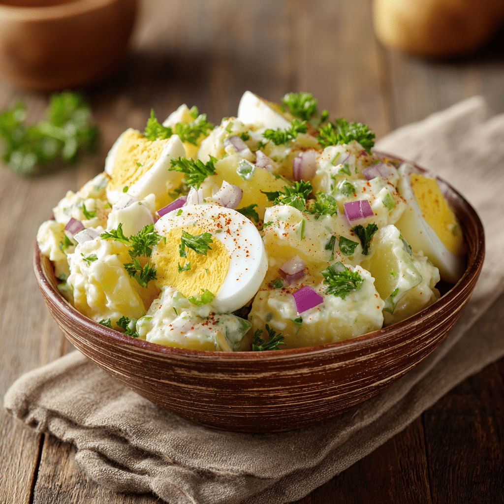 Use waxy potatoes for the best texture. Boil eggs with salt and vinegar for easy peeling. Make ahead — flavors improve after chilling.