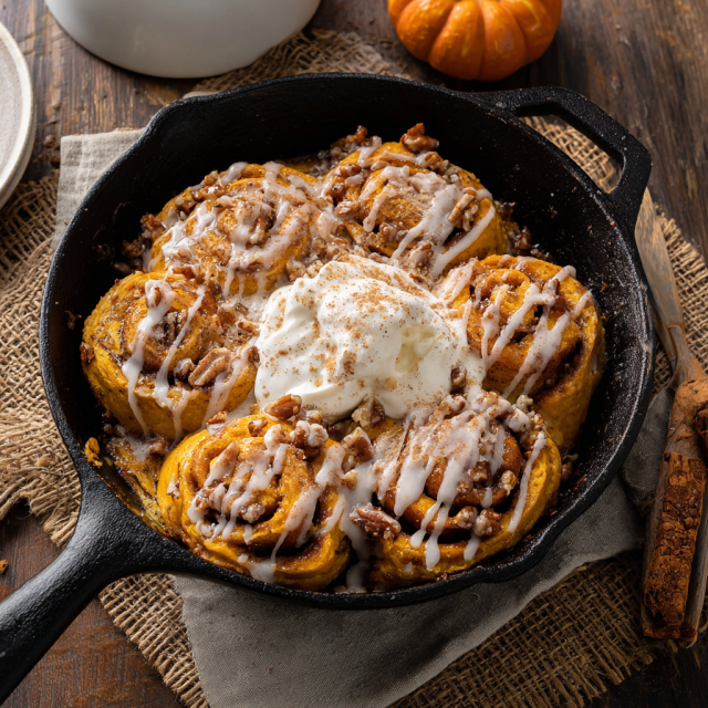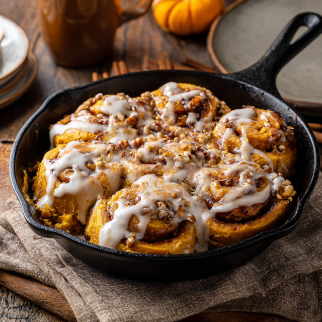 Drizzle the glaze over the warm rolls, grab a fork (or your favorite spoon), and enjoy that gooey pumpkin-cinnamon goodness straight from the skillet.