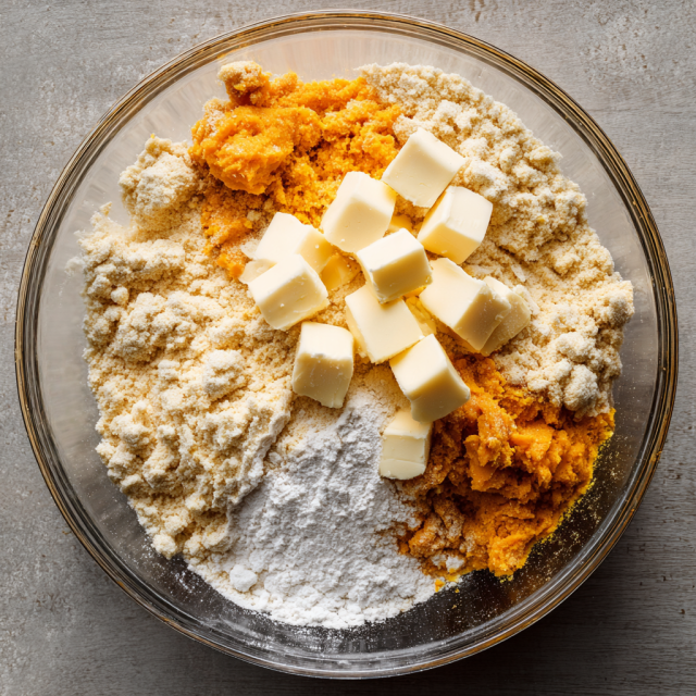 - Mix dry ingredients; add butter until crumbly. Stir in milk and pumpkin puree to form dough.