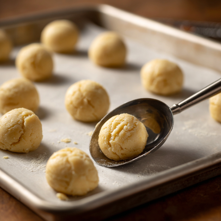 - Form dough balls, flatten slightly, place on sheet.