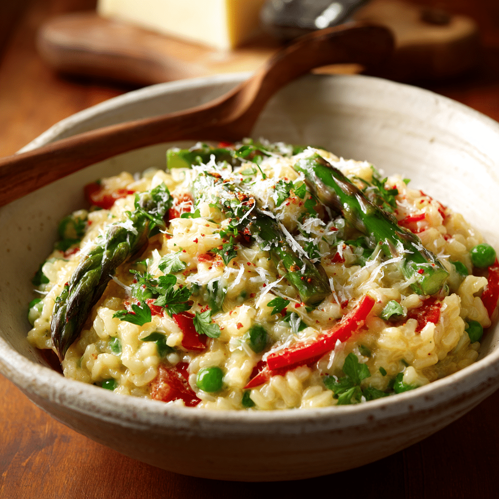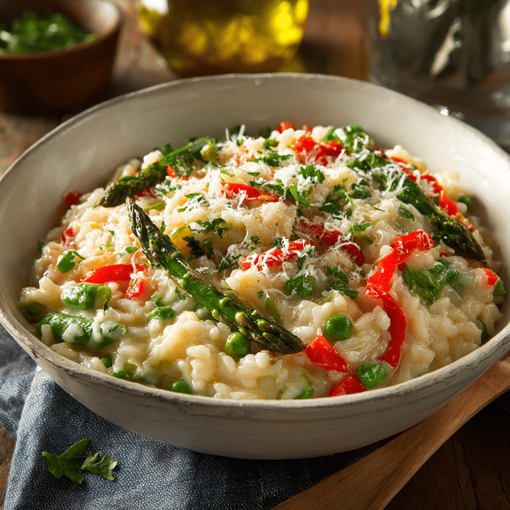 This Easy Spring Vegetable Risotto combines creamy Arborio rice with fresh asparagus, sweet peas, and vibrant bell peppers. Perfect for cozy family meals or a light spring lunch, it’s packed with flavor, color, and comfort.