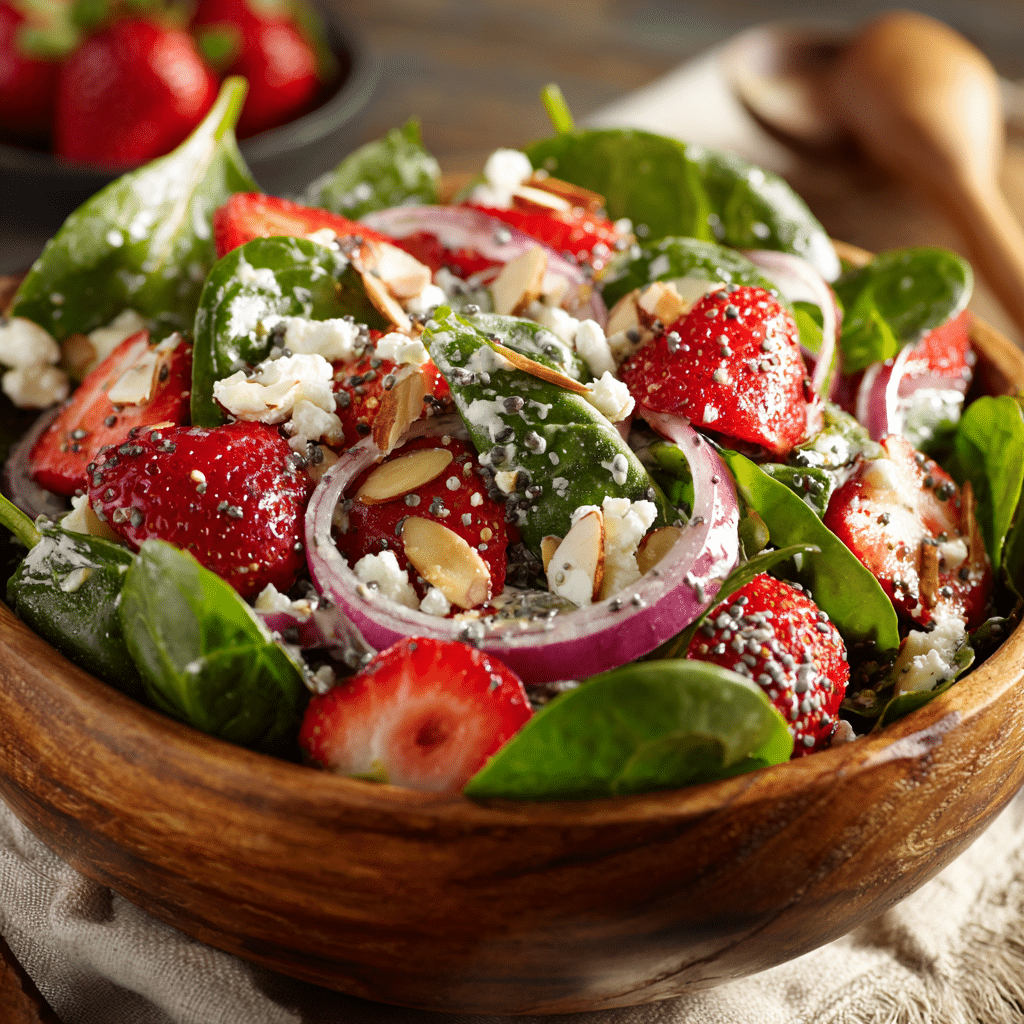 This Fresh Strawberry Spinach Salad with Poppy Seed Dressing is a colorful, refreshing, and healthy family favorite. Crisp baby spinach, juicy strawberries, red onions, and toasted almonds combine beautifully with a creamy poppy seed dressing. Feta cheese adds richness, while cherry tomatoes provide a burst of flavor. It’s easy to prepare, visually stunning, and perfect for brunch, lunch, or a light dinner side. Make the dressing ahead for convenience, but toss it with the salad just before serving to maintain freshness. Every bite is sweet, crunchy, and full of love a salad that brings smiles to the table.