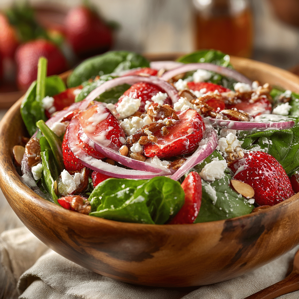 I love making this salad because it’s simple, healthy, and always a crowd-pleaser. The sweetness of the strawberries combined with the crisp baby spinach feels fresh and luxurious without being complicated. Toasted almonds or candied pecans add a crunchy texture that everyone enjoys, and the creamy feta provides a little indulgence.