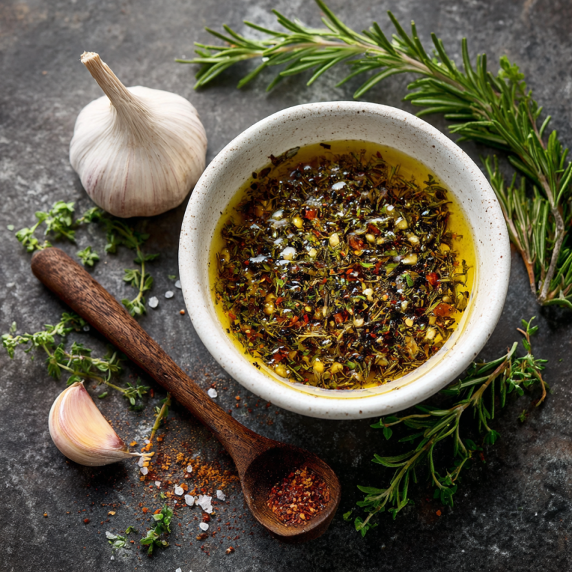 - Mix olive oil, garlic, herbs, and seasonings into a paste.