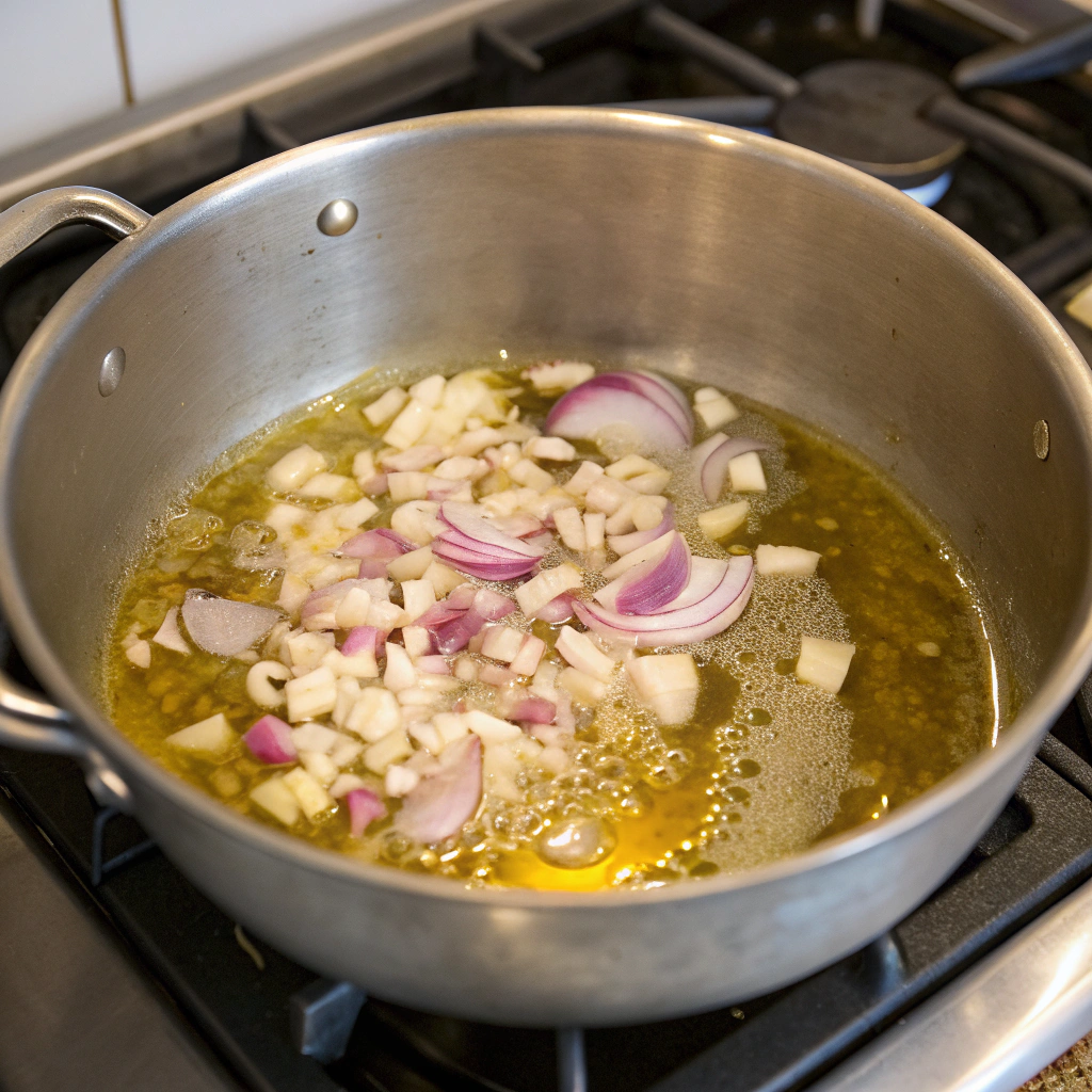 In a large pot, heat olive oil over medium heat. Add chopped onion and garlic, cooking until soft and fragrant, about 5 minutes. This builds the flavor base for the soup.