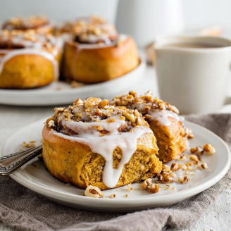Once the rolls are slightly cooled, drizzle that luscious maple glaze over the top. Watch it melt into every swirl of pumpkin and cinnamon.