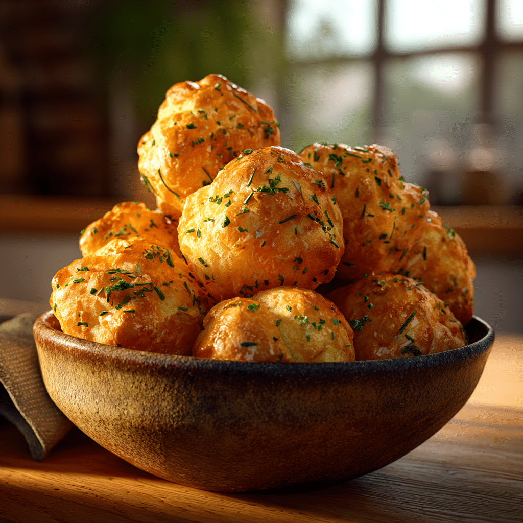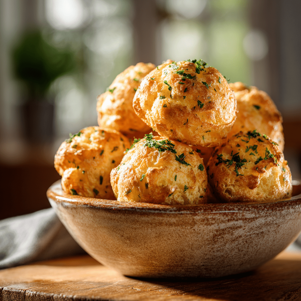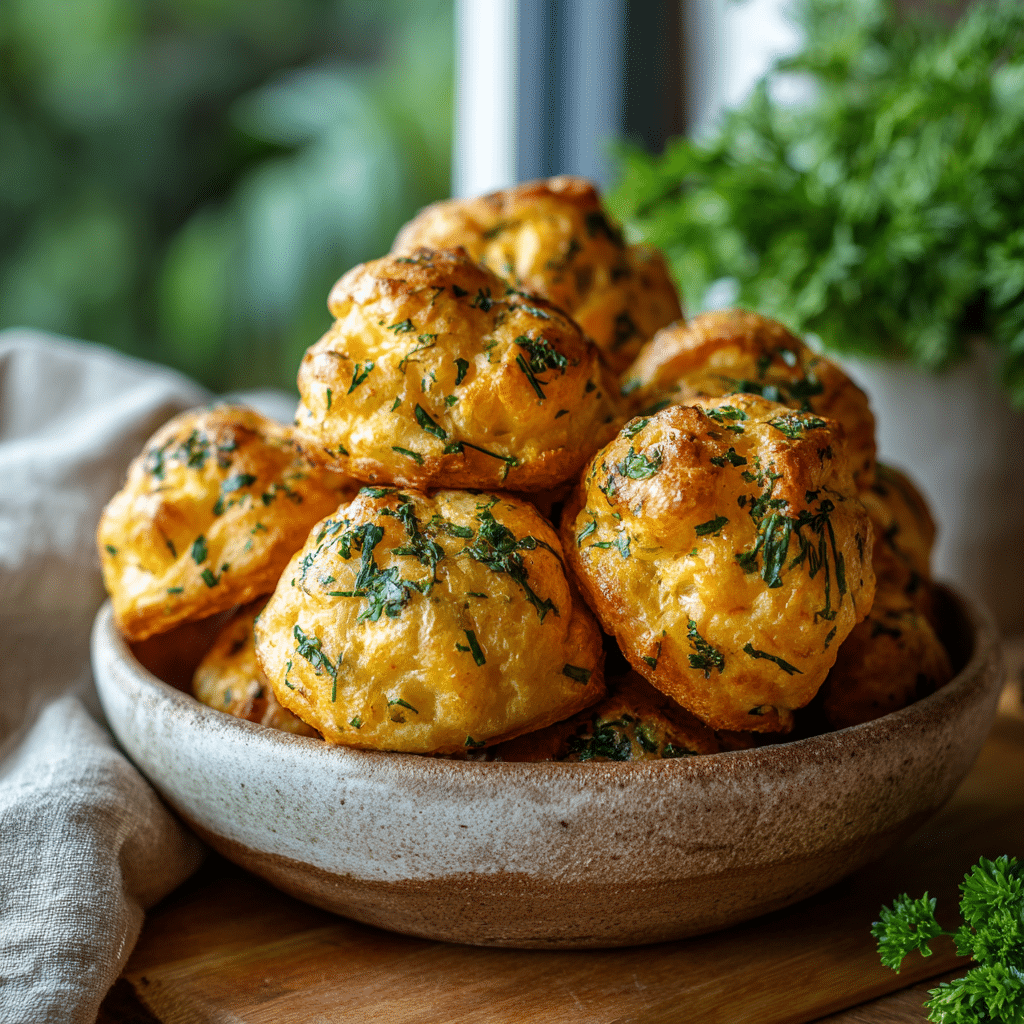 I make Gougères with Herbs when I want something simple yet impressive. These light, airy cheese puffs come together with butter, flour, eggs, and Gruyère, enhanced with fresh herbs like parsley and chives. I cook the dough, mix in eggs, add cheese and herbs, then bake until golden and puffed. They turn out crisp outside and soft inside. I serve them warm for gatherings, snacks, or alongside soup. I store leftovers in an airtight container and reheat in the oven. I can also freeze the dough for later, making this recipe perfect for easy entertaining.