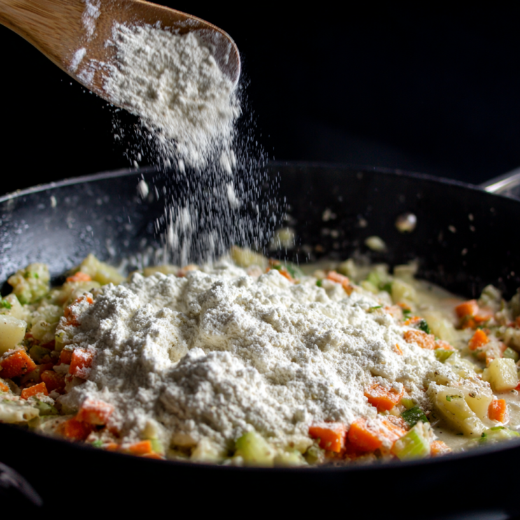 Sprinkle flour over the vegetables and stir well. Cook the flour for about 1 minute. This will help thicken your chowder later.